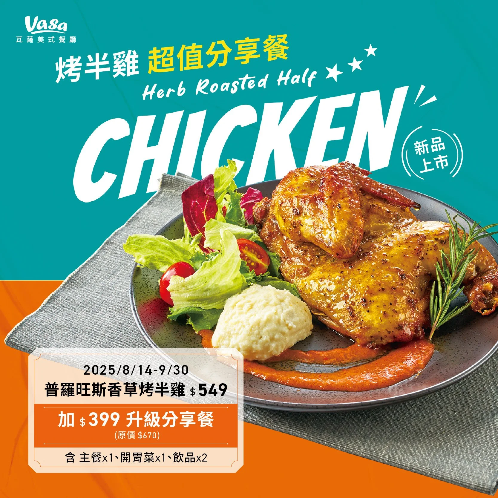 單點烤半雞,加$399升級超值分享餐 (原價$670)